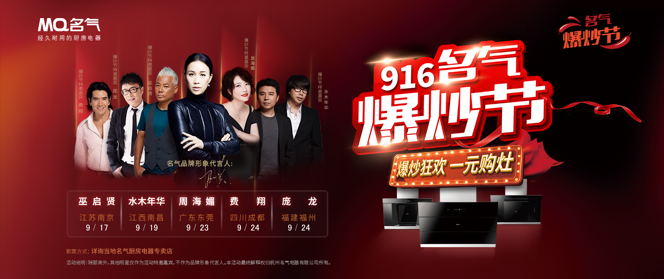9月是家電圈的盛事,MQ名氣廚房電器正式開展“爆炒節”,攜手其代言人冠軍導師那英以及眾多明星助陣,以“加1元送灶具”的超值優惠,在全國范圍內展開促銷活動,成功引爆家電圈,打響2017名氣品牌戰役的炮響。這是名氣繼“416爆炒節”后,再次開啟“爆炒”模式。