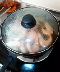 Step 2:熱鍋下油,油八成熱下花椒粒,蔥姜蒜爆香,下腌制好的蝦,兩面炒變紅