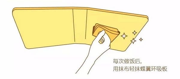 每次烹飪后都隨手用溫濕軟抹布蘸取中性洗滌劑擦拭機體外表面及蝶翼環吸板表面