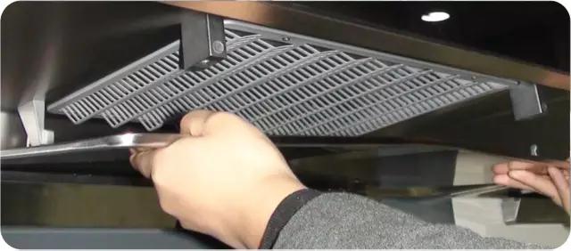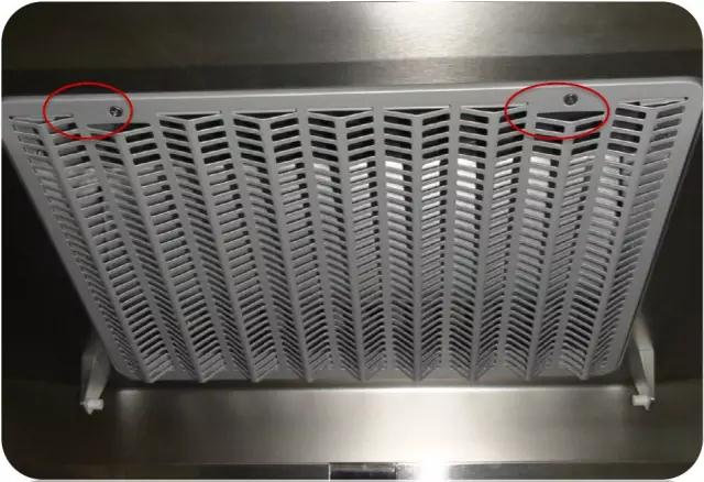 首先拆卸格柵:關閉電源前打開隔煙屏,雙手拉住格柵左右兩側,向外拉即可打開格柵,將格柵向下旋轉一定角度,并向外抽拉即可將其卸下;然后,同樣用浸有中性清洗劑的軟抹布清洗格柵并擦拭進風口圈外表面。