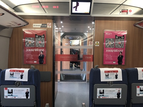 實現了廣告全方位覆蓋的包圍式傳播,通過頭片+桌貼+海報+車廂內自動門貼+玻璃門貼+桌板創意貼+播音提示+車廂兩端LED顯示屏+車外身彩貼品牌露出的全媒體宣傳,在高鐵封閉的傳播環境中,無處不在的品牌形象和產品潛移默化地植入乘客的潛意識,形成影響心智的品牌效應。